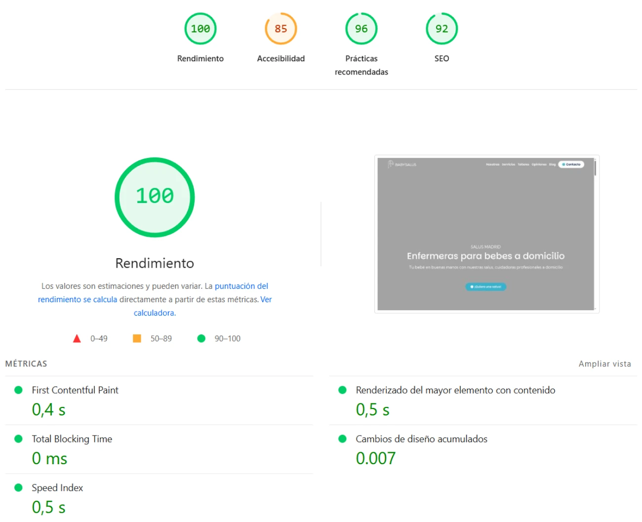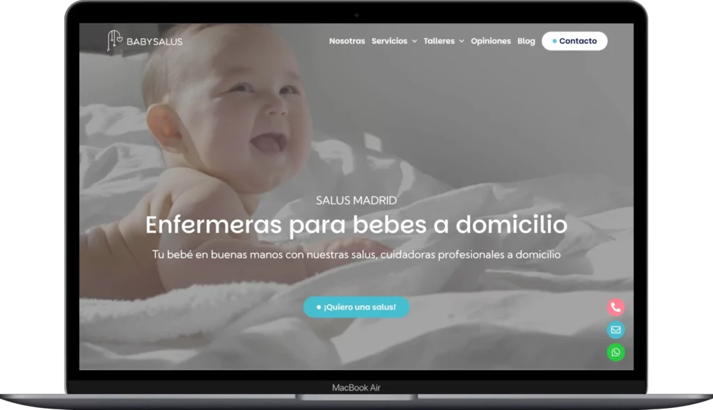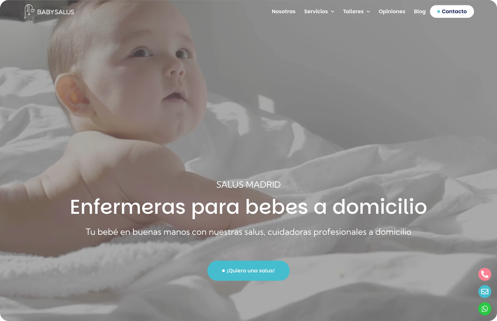 Babysalus nace con una misión muy clara: ofrecer tranquilidad a las familias durante uno de los momentos más importantes de sus vidas. Su servicio conecta a padres y madres con enfermeras pediátricas y enfermeras salus altamente cualificadas que acompañan el cuidado del bebé en casa durante los primeros días o semanas. Un servicio tan delicado y basado en la confianza necesitaba una presencia digital que transmitiera seguridad desde el primer instante.