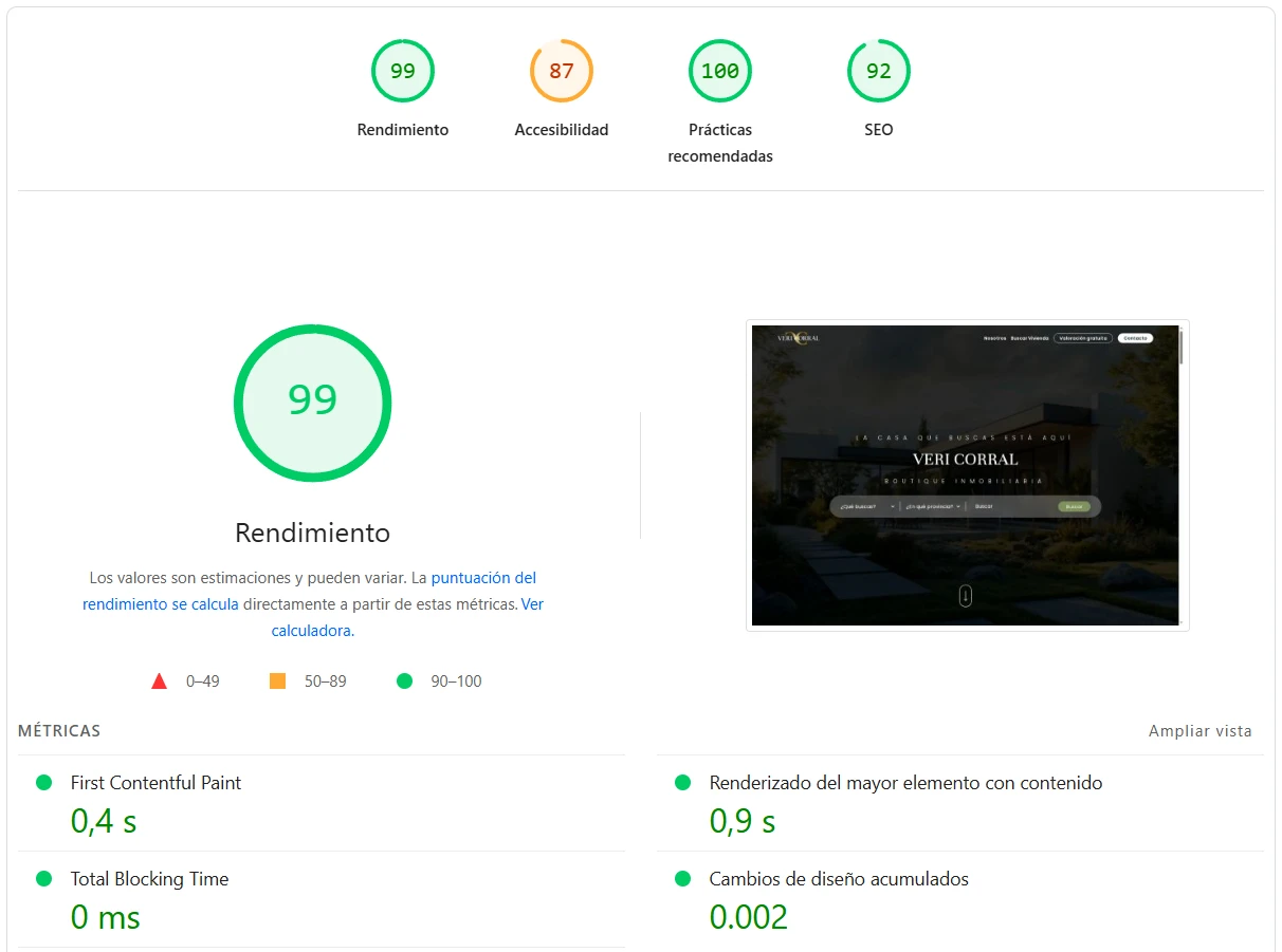 En el fascinante mundo de las inmobiliarias, Vericorral es un acierto seguro. Son familiares, les encanta lo que hacen y sobretodo grandes profesionales. Sobra decir que su competencia es enorme, así que no vale solo con renovar o modernizar la imagen (que también es importante), sino hacer que funcione rápido. Hablamos de cuestiones técnicas muy necesarias, porque una web con tanta carga de medios y entradas no debe ir lenta, debe cargar como la luz.