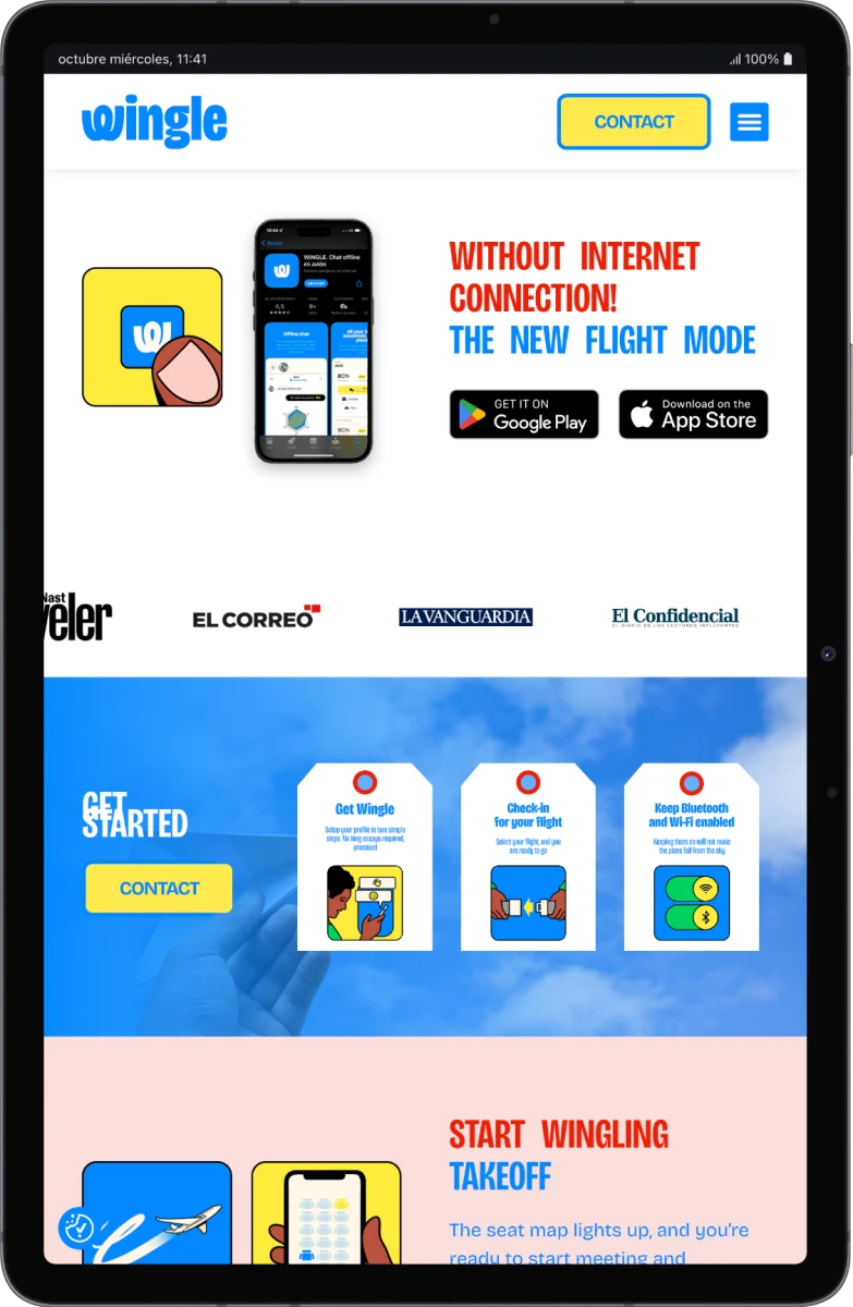 Wingle es un proyecto sencillo. Cada negocio tiene sus necesidades, y las de éste son exclusivamente anunciar en su web su App móvil. ¿Y de qué va la app? De conectar a pasajeros en un mismo vuelo sin necesidad de avión. Si te atreves más o menos es cosa tuya, pero el mensaje es claro, bien conciso y además divertido.
